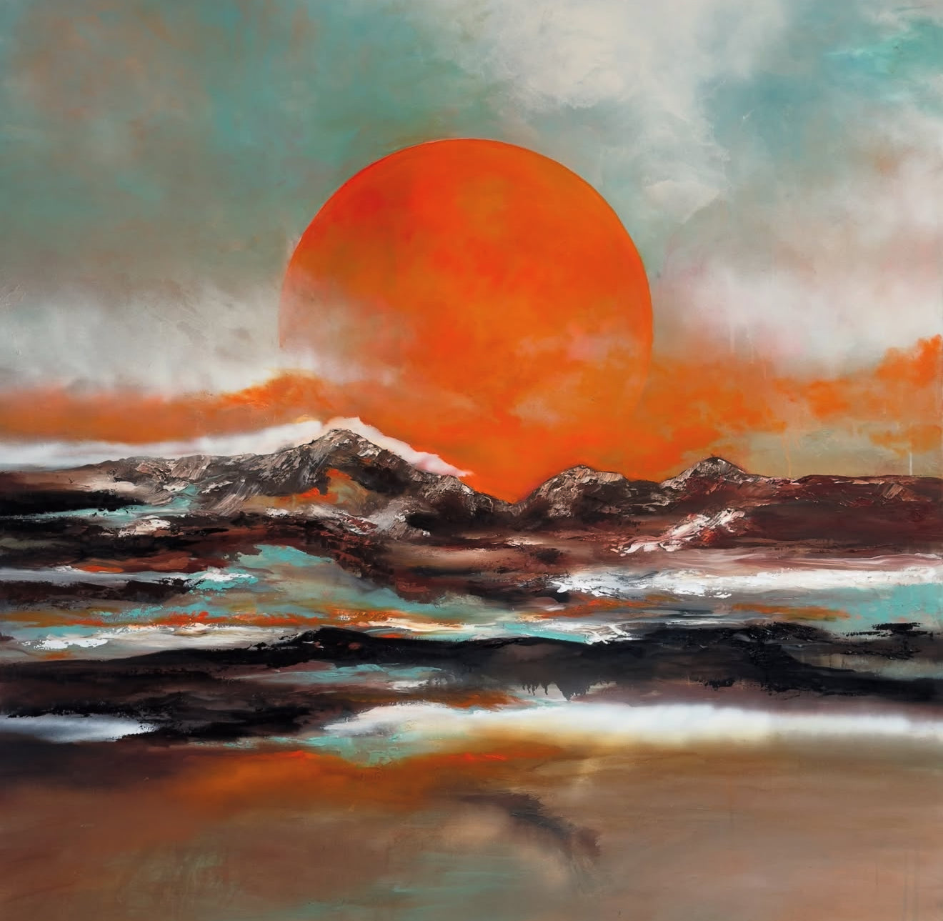 A bold, glowing sun hovers over a fractured horizon, its warmth dissolving into cool mist and shadow. Sweeping layers of oil and texture suggest a landscape in quiet transformation, where intensity softens into stillness and light feels almost tactile. A balance of power and pause.